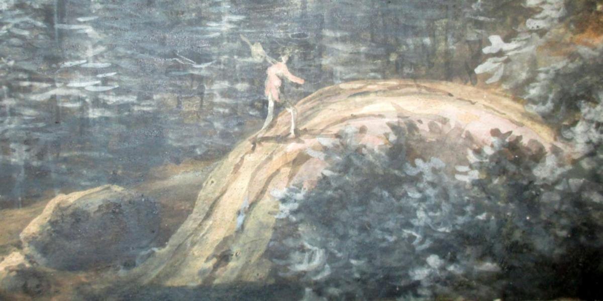 Fransk kunstner, 19. årh. : Vandrer i landskab. Omkring 1810 - 1840. I nærheden af en større by. Gouache på malerpap. Usigneret.37 x 54 cm. På bagsiden etiketter. I samtidig mahogni ramme med hjørne ornamentik.