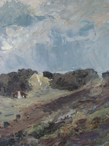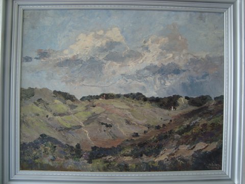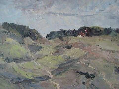 Maleri - Carl Johan Tandrup - Parti fra Rebild Bakker med Top Karens Hus og Blokhuset.