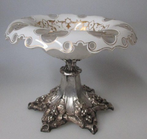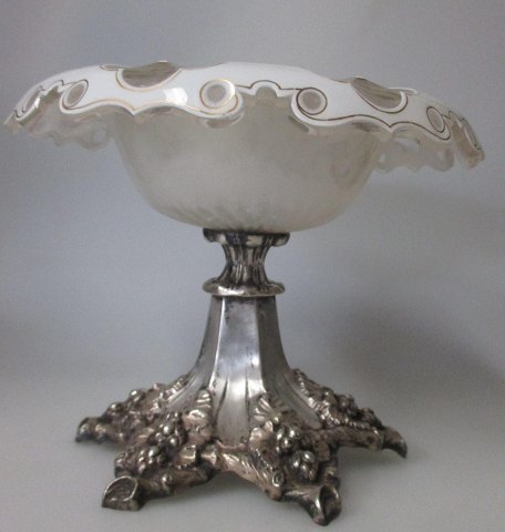 Opsats i sølv med krystal skål, o. 1880. Tyskland. Seks kantet fod med dekorationer i form af grene, bladværk og frugter. Flæset skål i krystal med hvidt overfang med gennemslibninger. Med forgyldt dekoration. H.: 14,5 cm. Dia kumme: 19 cm. Ingen synlige mester stempler. Ingen kantafslag. Flot stand! Udfyldt stamme.