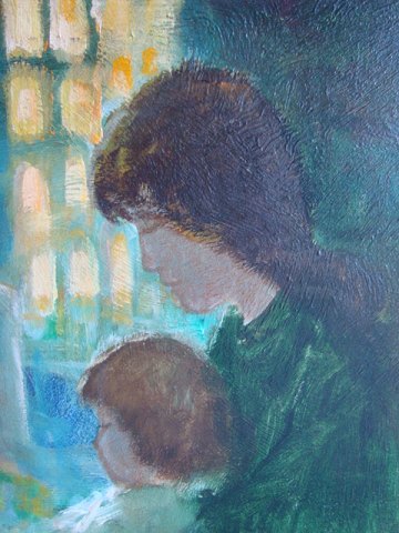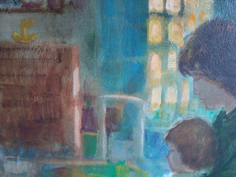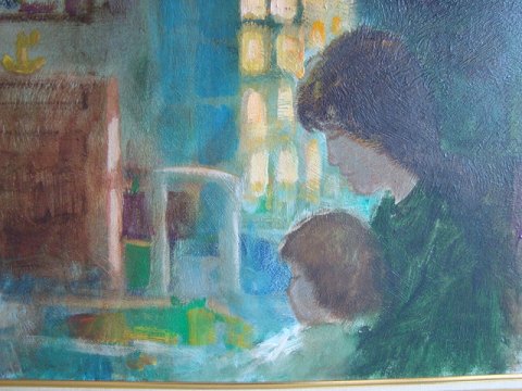 Maleri af Thomas Traasdahl - Mor og barn i interiør.