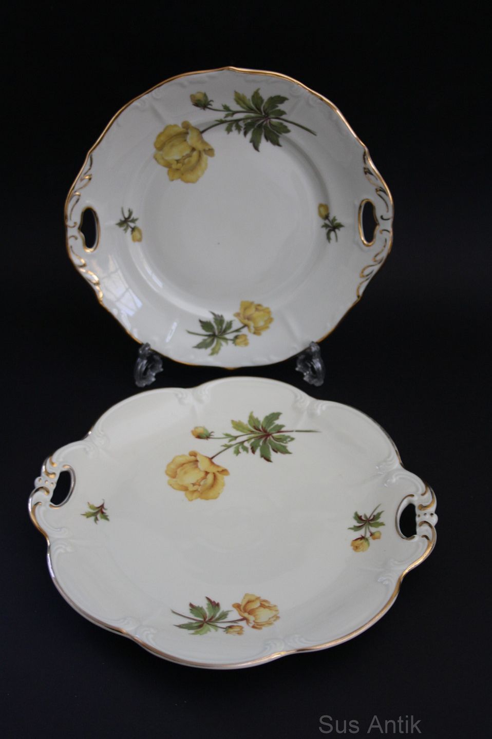 Bavaria, Tirschenreuth, Engblomme, dekoreret på Antoinette eller Marie Antoinette cremefarvet stel med gule blomster og guldkanter. Importeret af Norden og senere Bucka og Nissen. Stellet er dekoreret i Danmark.