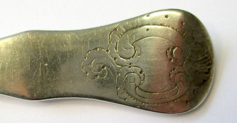 Joachim Weller (ca. 1725 - 1792) Holstebro: Barok spiseske i sølv. Med violin skaft med rococo dekorationer. Ligedeles dekorationer på laf. L.: 19,2 cm. Vægt: 48 gram. Mester stemplet: IW.