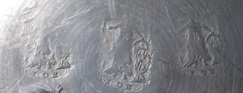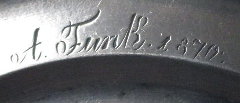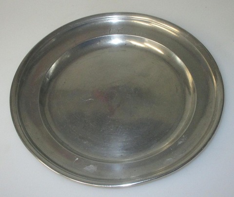 Tysk tintallerken, 19. årh. Med nvnet: A. Funk 1870 indgraveret på fanen. Stemplet som engelsk tin. Dia.: 22,8 cm.