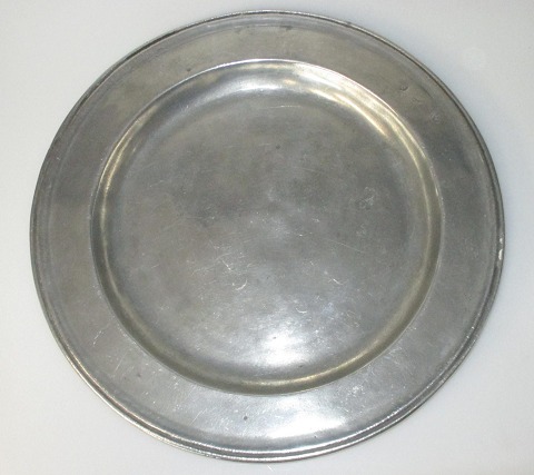 Stort antikt tinfad, 1800-tallet. Stemplet på fanen. Dia.: 33,8 cm.