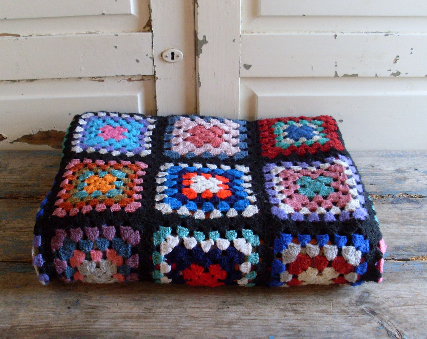 Skønt stort hæklet tæppe i papegøjefarver.