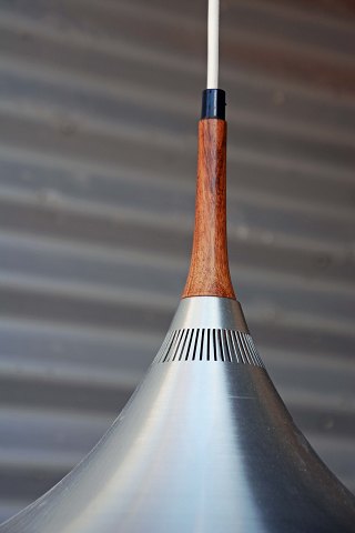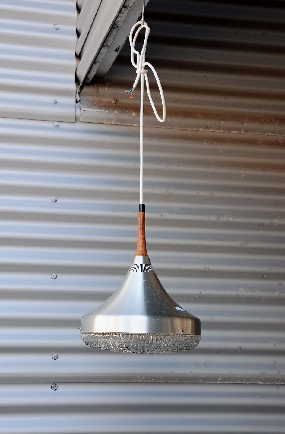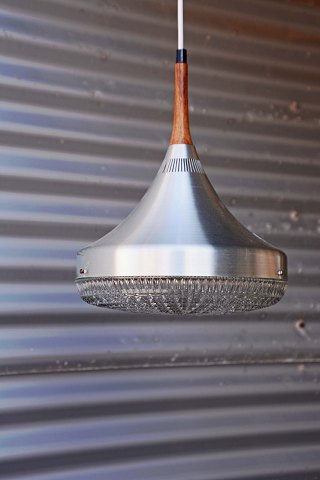 Loftslampe i teak og stål/alu med facetteret glas. Den er i pæn stand med intakt glas. H: 32 cm. Ø: 26 cm.