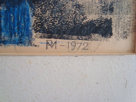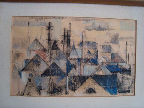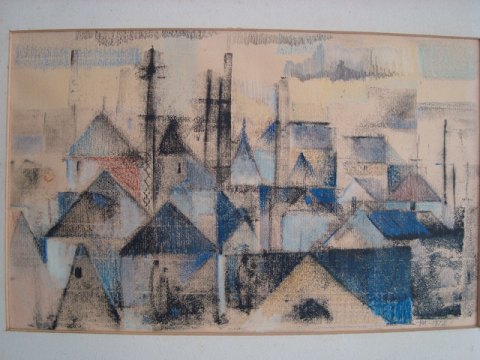 Pastel af Poul Møller - Vue ud over hustage og master 1972.