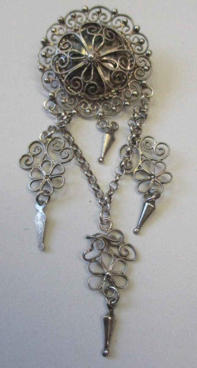 Brooch in silver, with filigree. 20th century. Stamped: 830 s. Dia .: 2.8 cm. L .: 7 cm.