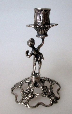 Miniature sølv lysestage, 19. årh. Med en lille engel.Fod med rosenmønster. H.: 7,6 cm. Stemplet.