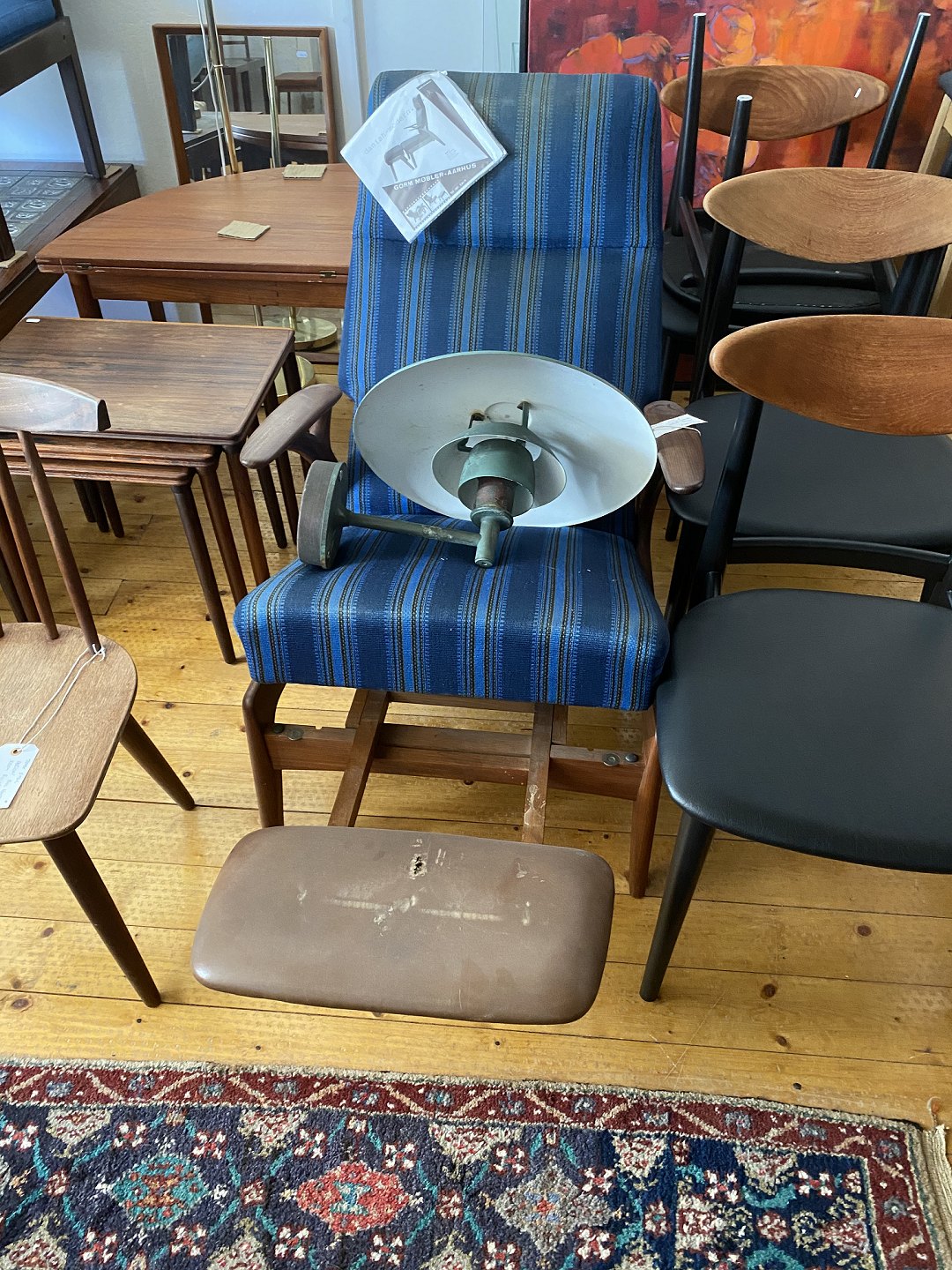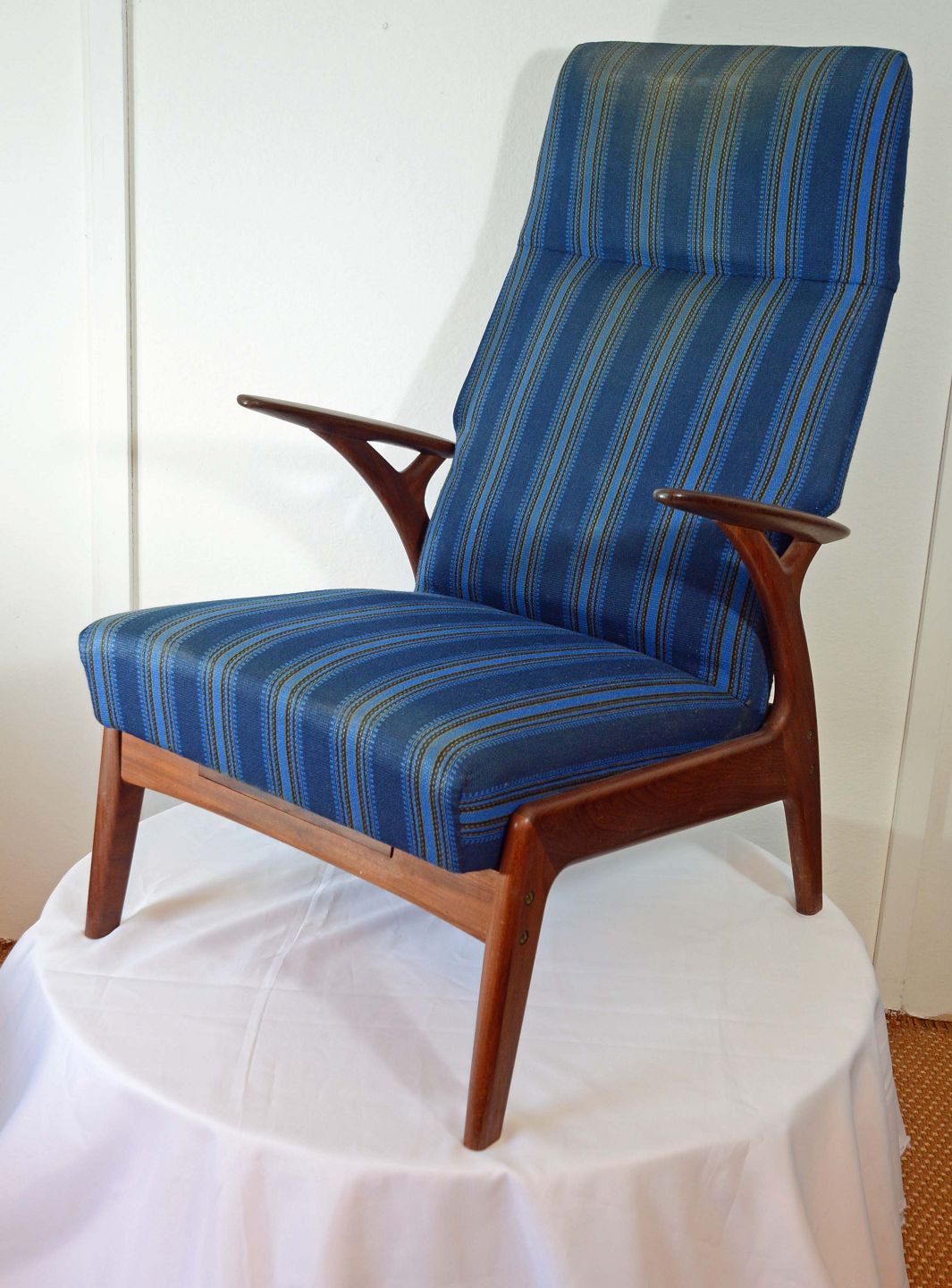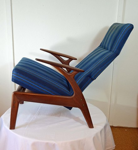 Højrygget læne-/hvilestol model II af Christian Sørensen. Fremstillet hos Gorm møbelfabrik, Aarhus i 1960'erne. Stel af teaktræ. Sæde og ryg med vip. Betrukket med blåstribet møbelstof. Slid i stoffet ved hovedstøtten.