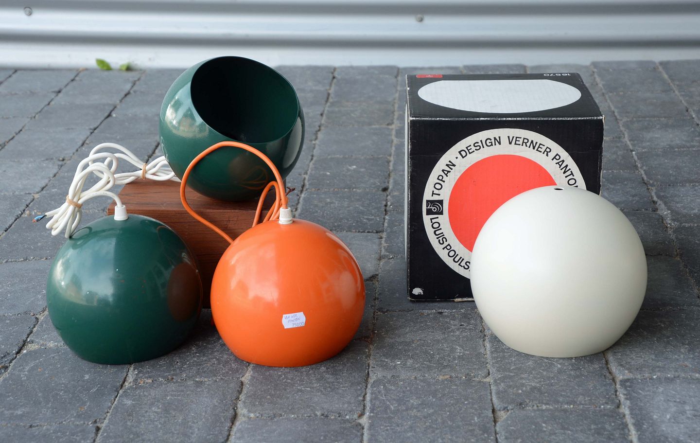 4 stk. "Topan" loftslamper design af Verner Panton for Louis Poulsen. Brugsspor på orange og grønne lamper - ridser og sprøjt af maling. Den hvide er næsten som ny.