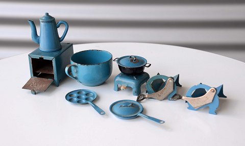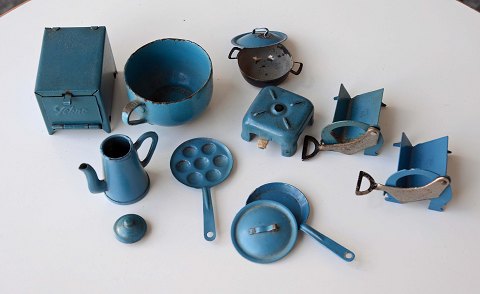 Tekno legetøj. Køkkenredskaber i miniformat fra Tekno i blåmalet og rødmalet metal. Brugsspor. God brugt stand.