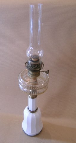 Heiberg olielampe, hvidt opalglas med original brænder, olieglasbeholder og lampeglas. Danmark ca. 1900, h: 57 cm