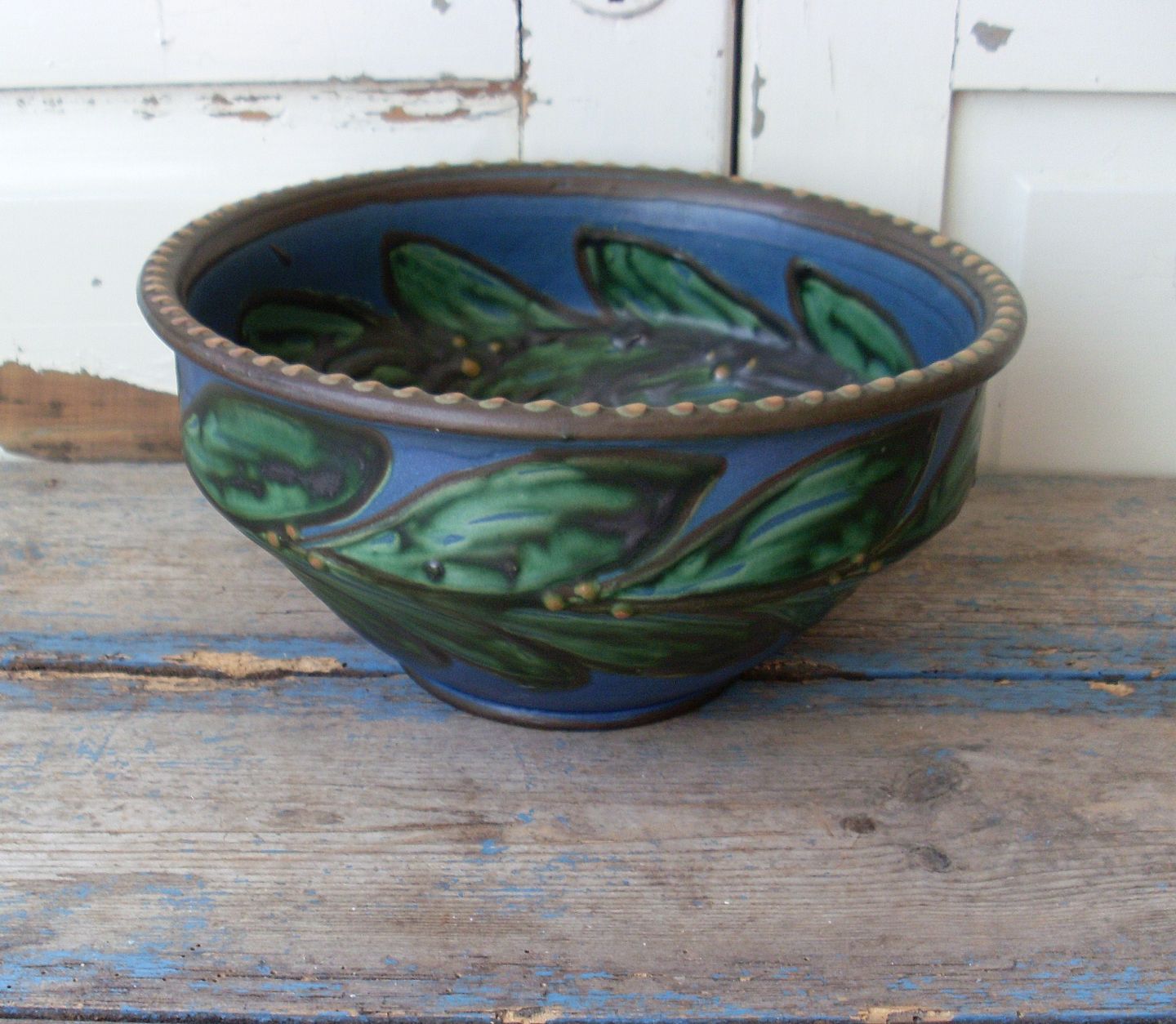 Kähler stor kohorns dekoreret skål i blå, grøn og brune nuancer.