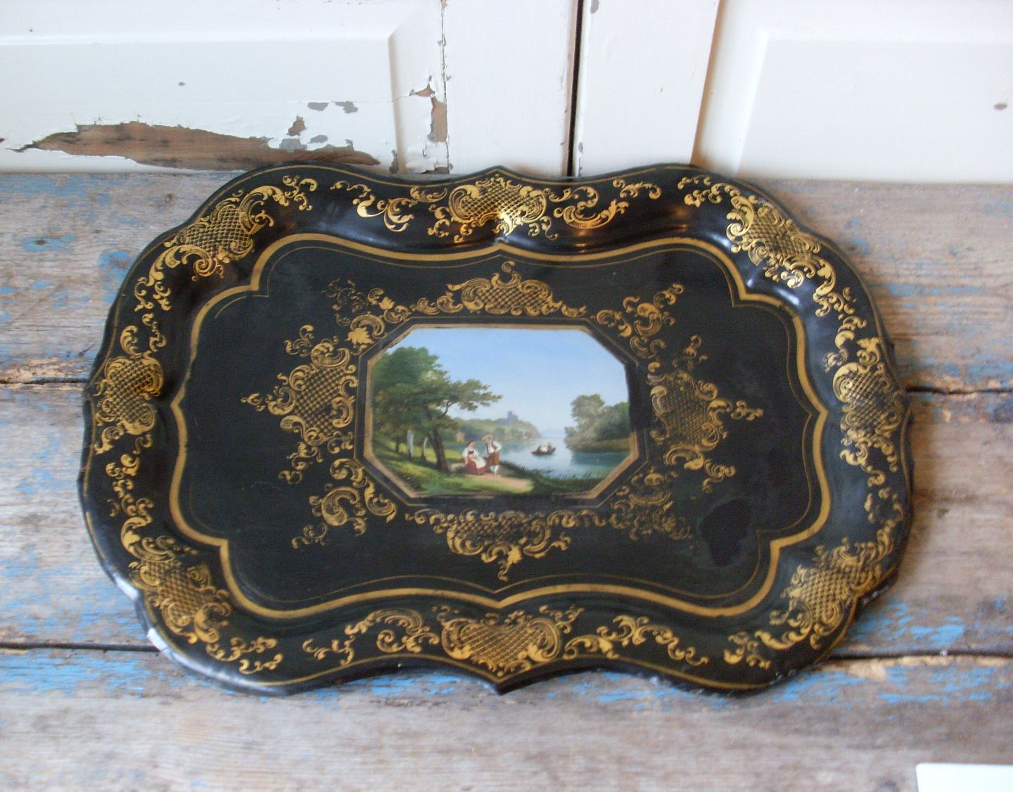 Victoriansk metalbakke, meget smukt bemalet landskabs motiv, rigtig flot stand.