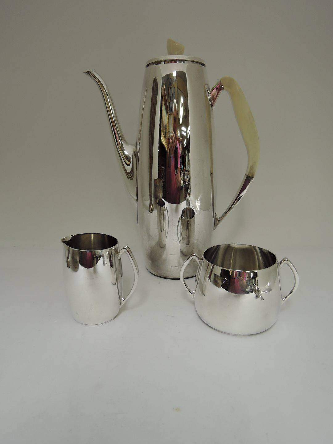 A F Rasmussen. Kaffe service 3 dele. Bestående af kaffekande, flødekande og sukkerskål. Sterling (925). Højde på kaffekande er 26,5 cm.