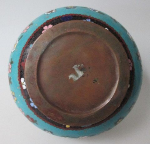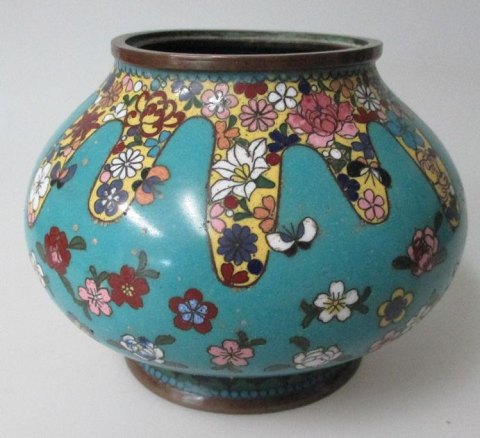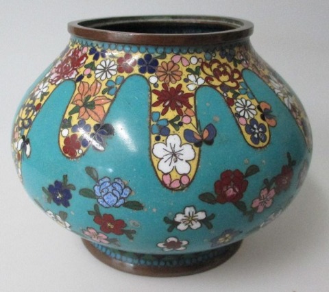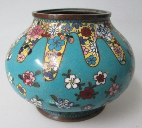 Kinesisk cloisonnè vase 19/20. årh. Polykrom emalje på kobber. Dekoreret med blomster og sommerfugle. H.: 10 cm. Dia.: 12 cm.