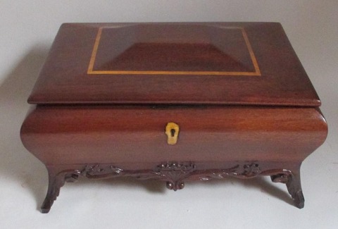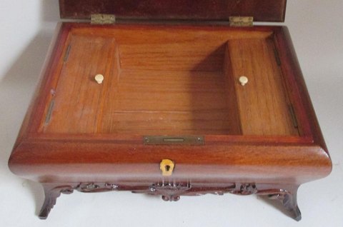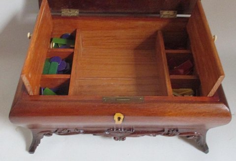Mahogni skrin til kort og jetoner, Danmark. 1920. Poleret. Med intarsia i lyst træ og skæringer. Capriole ben. 38 x 27 x 18 cm.