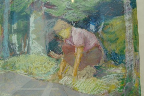 Pastel af Nis Stougaard - Pige ved skovsø 1950'erne.