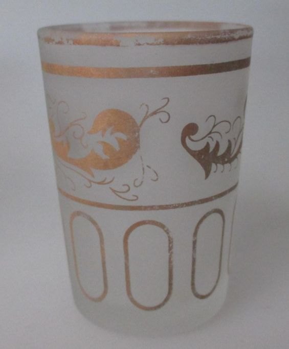 Vodka glas. Farveløs matteret glas. Tyskland, ca. 1880. Med forgyldning. H.: 6,3 cm.