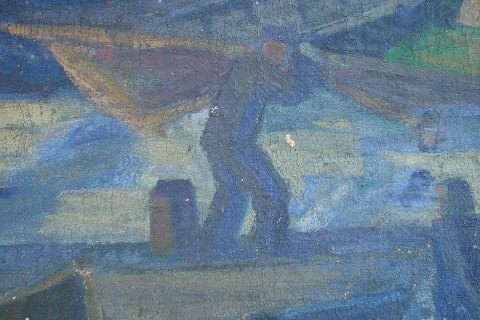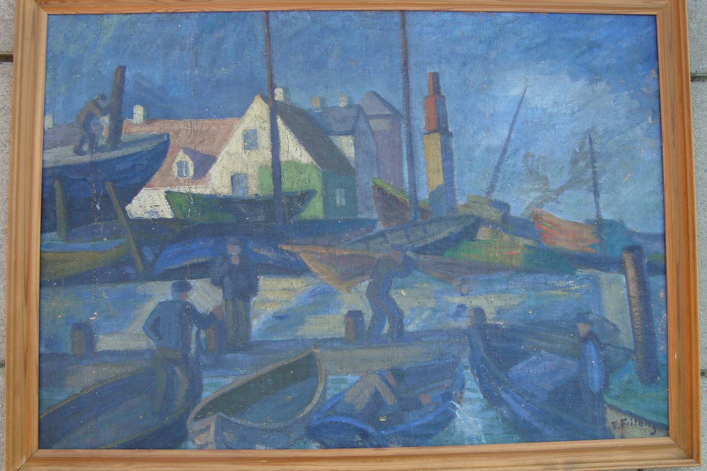Maleri V. Feilberg - Havneparti med arbejdende fiskere ved deres både.