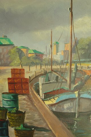 Maleri - Parti fra Slotsholmskanalen med Børsen, Christiansborg Slot og Holmens Kirke (Bremerholm).