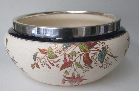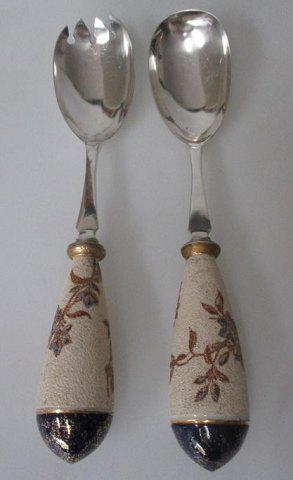 Engelsk salatsæt i fajance, Crown Albion, ca. 1900. Bestående af skål og to salatdele. Creme farvet med polykrome dekoration af planter og blomster. Med forgyldninger. Skål med forsølvet kant. Salatsæt med stål. Dia. skål: 23 cm. H.: 10 cm. Længde bestikdele: 24,5 cm.