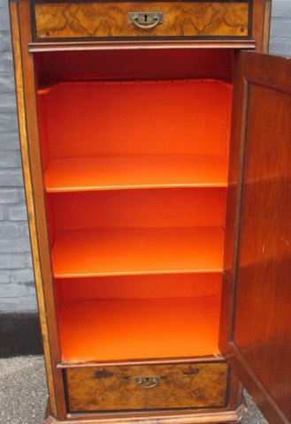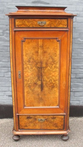 Sølv tøjs skab, valnød, 19. årh. Danmark. Fineret med rodtræ. Københavner top. Indvendig orangemalet. H.: 158 cm. B.: 74 cm. D.: 43 cm.