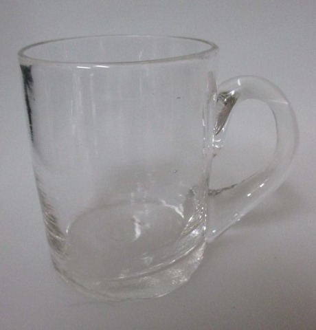 Punche krus/ Børne krus, 19. årh. Danmark. Klart glas. Rørformet korpus med påsat hank. Udekoreret. Antagelig Ålborg Glasværk.