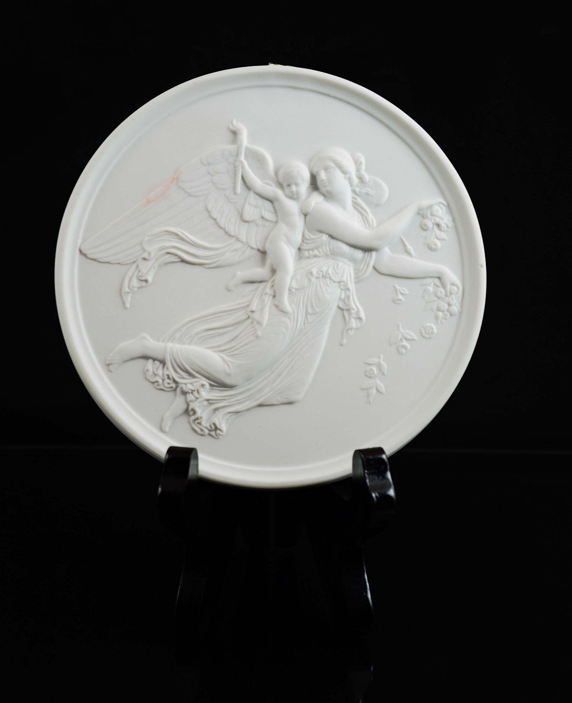 Vægplatte i Biscuit fra Bing og Grøndahl. Motiv - engel med et barn og en fakkel. Stemplet. Intakt. 1. sort.