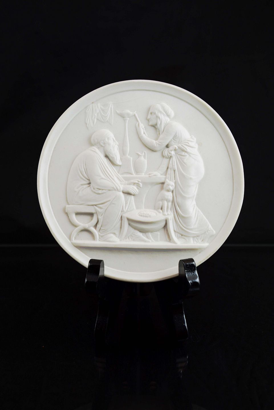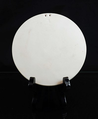 Vægplatte i Biscuit fra Bing og Grøndahl. Motiv - Kvinde, mand og kat. Stemplet. Intakt. 1. sort.