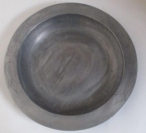 Stort antikt tinfad, 1853. Stemplet med mestermærke: GD L. Fane dekoreret med bladværk. På fane inskription: Christian Kruse 1853. Dia.: 40 cm. H.: 4,5 cm.