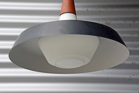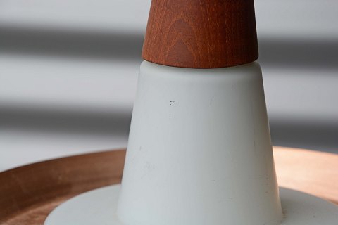 Loftslampe med teaktop, lakeret metal og opalhvid glas