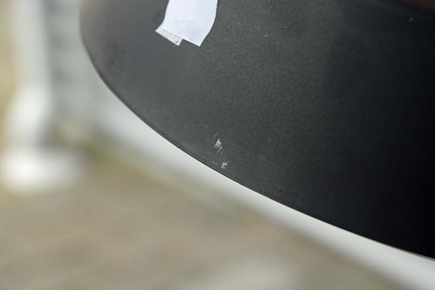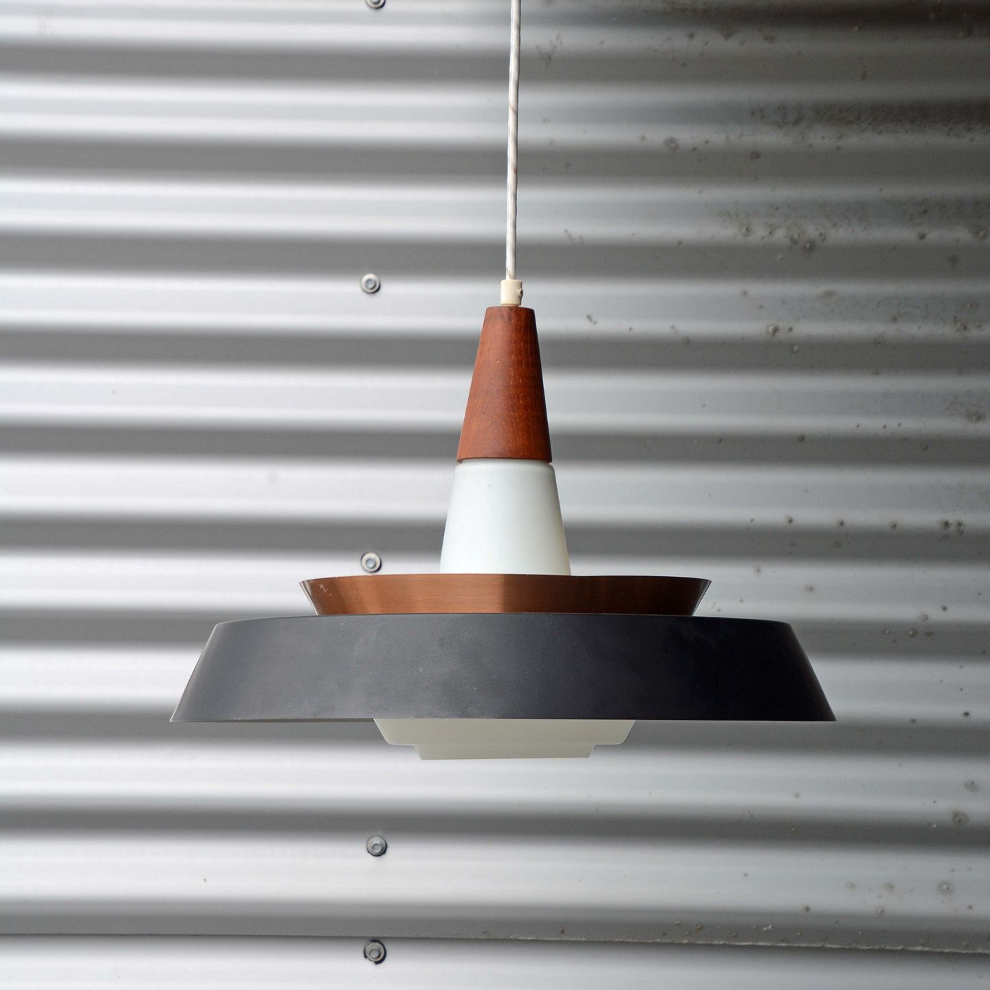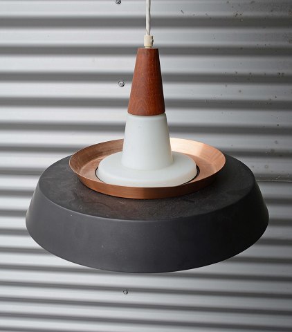 Loftslampe pendel med teaktop og opalhvid glas samt skærm af kobber og sortlakeret metal. Intakt glas med enkelte brugsspor på skærmen.