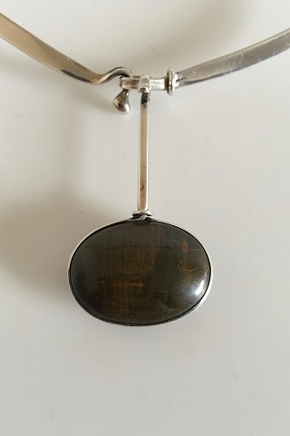 Georg Jensen Sterling Silver Torun Neckring No 168 with Pendant No 129 made of Jasper Stone. Designed by Vivianna Torun Bülow-Hübe. The neckring is 16.5 x 13.5 cm wide (6 1/2" x 5 5/16"). The pendant measures 3.1 x 2.5 cm (1 7/32" x 0 63/64"). Combined weight is 29 g / 1.05 oz