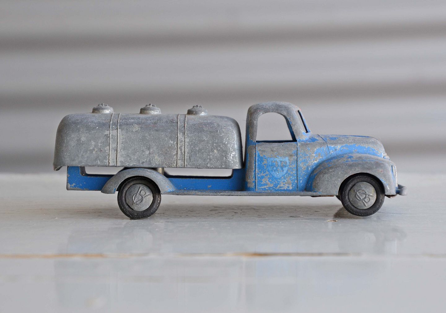 Legetøjsbil "BP" fra Brdr. Pedersen. Stemplet B.P. legetøj, Denmark. Bilen mangler et dæk, men hjulkapsel og enkeltdele medfølger. Fremstår med synlige brugsspor.
