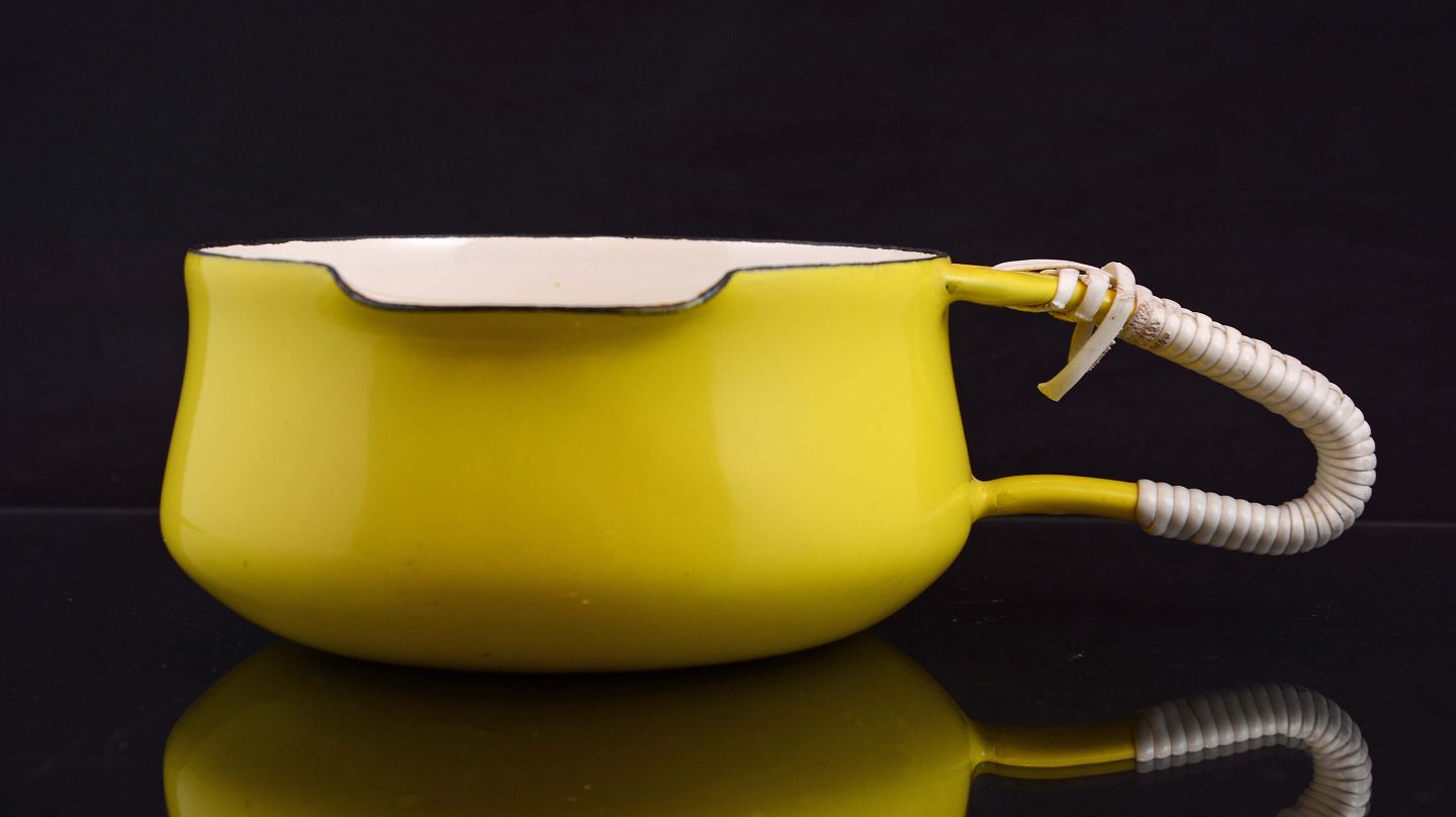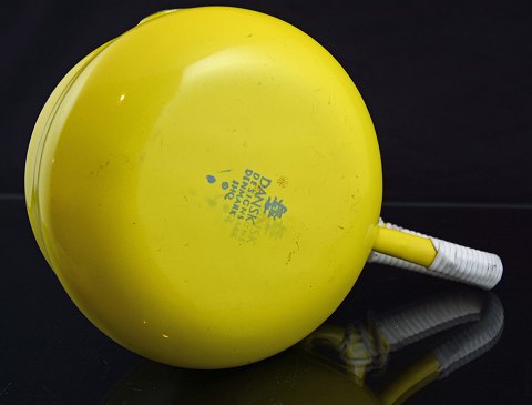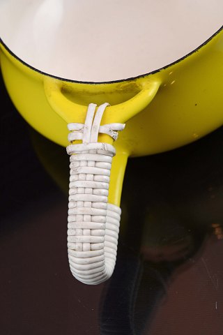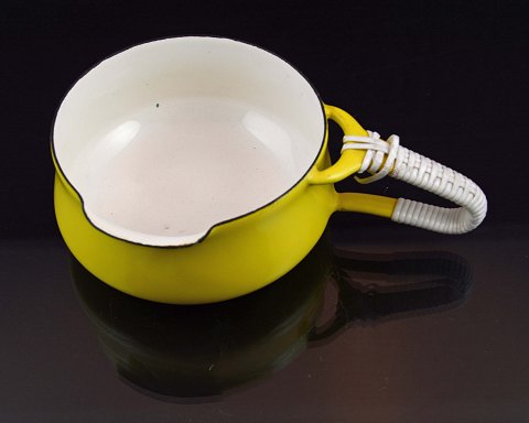 Emalje saucekande designet af Jens Harald Quistgaard. Kanden er stemplet IHQ. Den står med løsrevet plastflet i toppen af hanken. Få brugsspor - ridser i bunden og minimalt afslag et sted i emaljen.