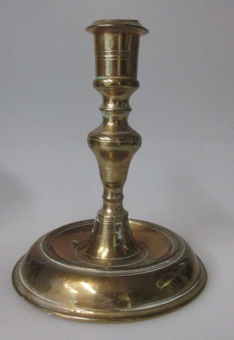 Dansk 1700-tals Næstved stage i messing med rund fod og profileret stamme. Danmark