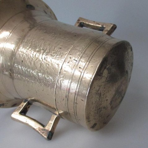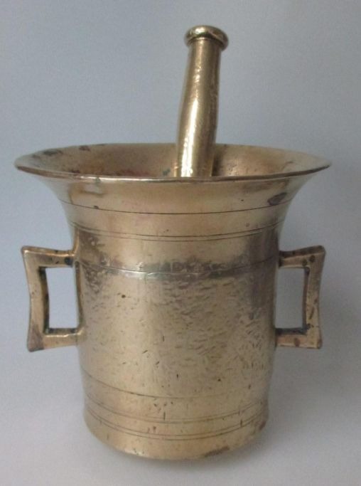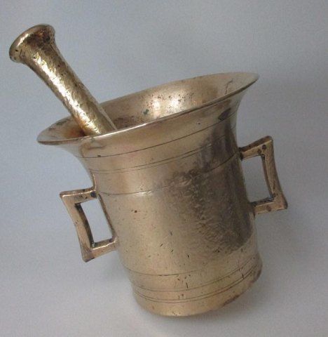 1800-tals messing morter med pistil med to hanke. Højde: 15 cm. Længde pistil: 22,5 cm.