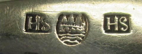 Sølv ske, Hinrich Henningsen Schmidt (1766 - 1825), Tønder, Danmark. Stemplet med mestermærke og bymærke. L.: 21,5 cm.