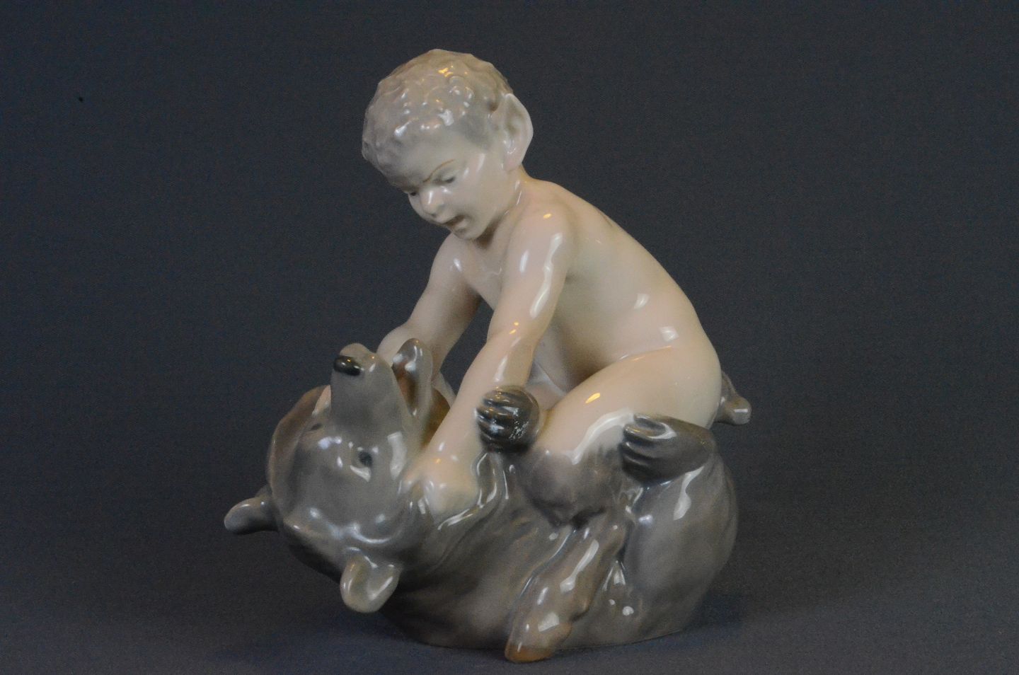 Porcelain Figure: Royal Copenhagen, Faun with bear, h: 19 cm