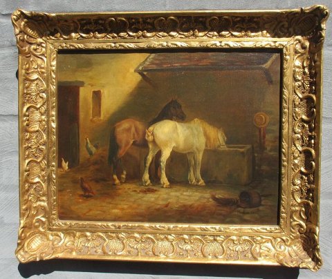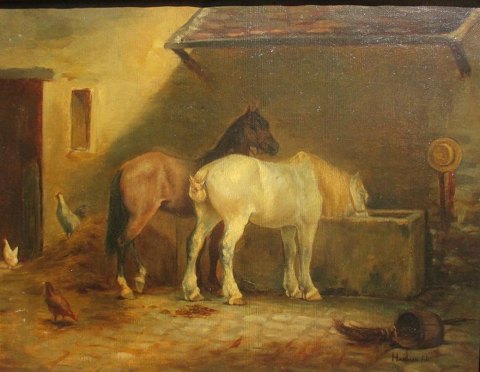 Hamman, Edouard Michel Ferdinand (1850 -) France: Horses at the water trough. Oil on canvas. Signed .: Hamman fils. 32 x 41 cm.