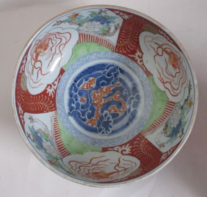 Large Japanese Imari porcelain bowl, 19th century. With deep u-shape, decorated with flowers and ho-o-bird. Field decorated in red, gold and blue. On the sides signs and decorations. H .: 13 cm. Dia .: 31 cm.