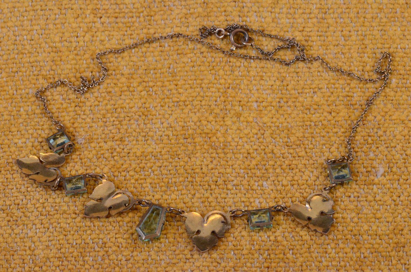 Collier forgyldt prydet med blade og imiteret aquamarin sten. Str.: 48 cm