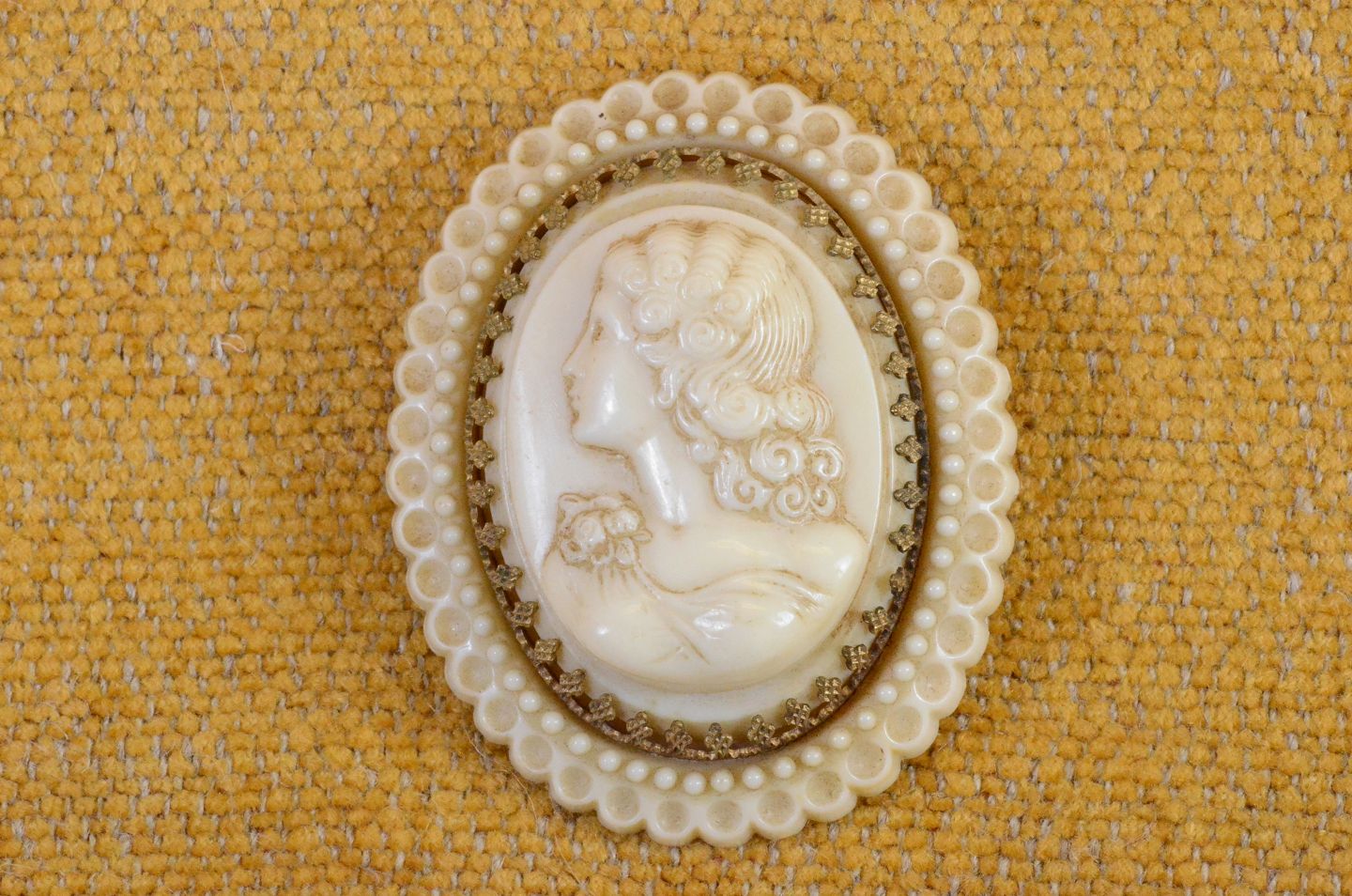 Cameo lady head molded in in bakelite, french ivery, with decorative edge of brass. Size .: 5.5 * 4.5 cm. Art. No. 25