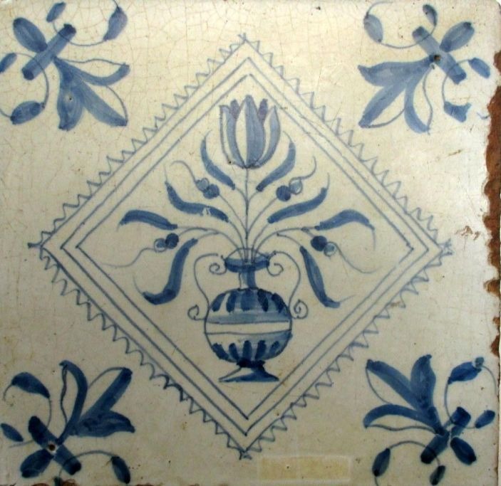 Dutch tile, 1675 - 1725, with corner decorations in the form of the French lily (N'speerpunt). The central decoration in the form of poppies in a vase.12,8 x 12.8 cm.