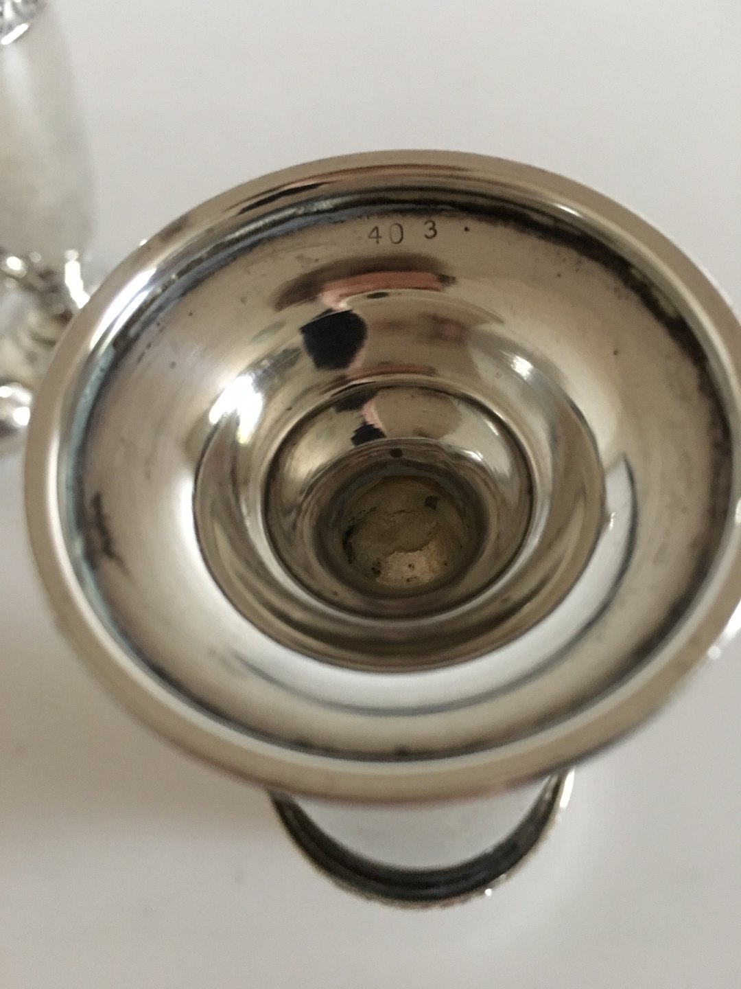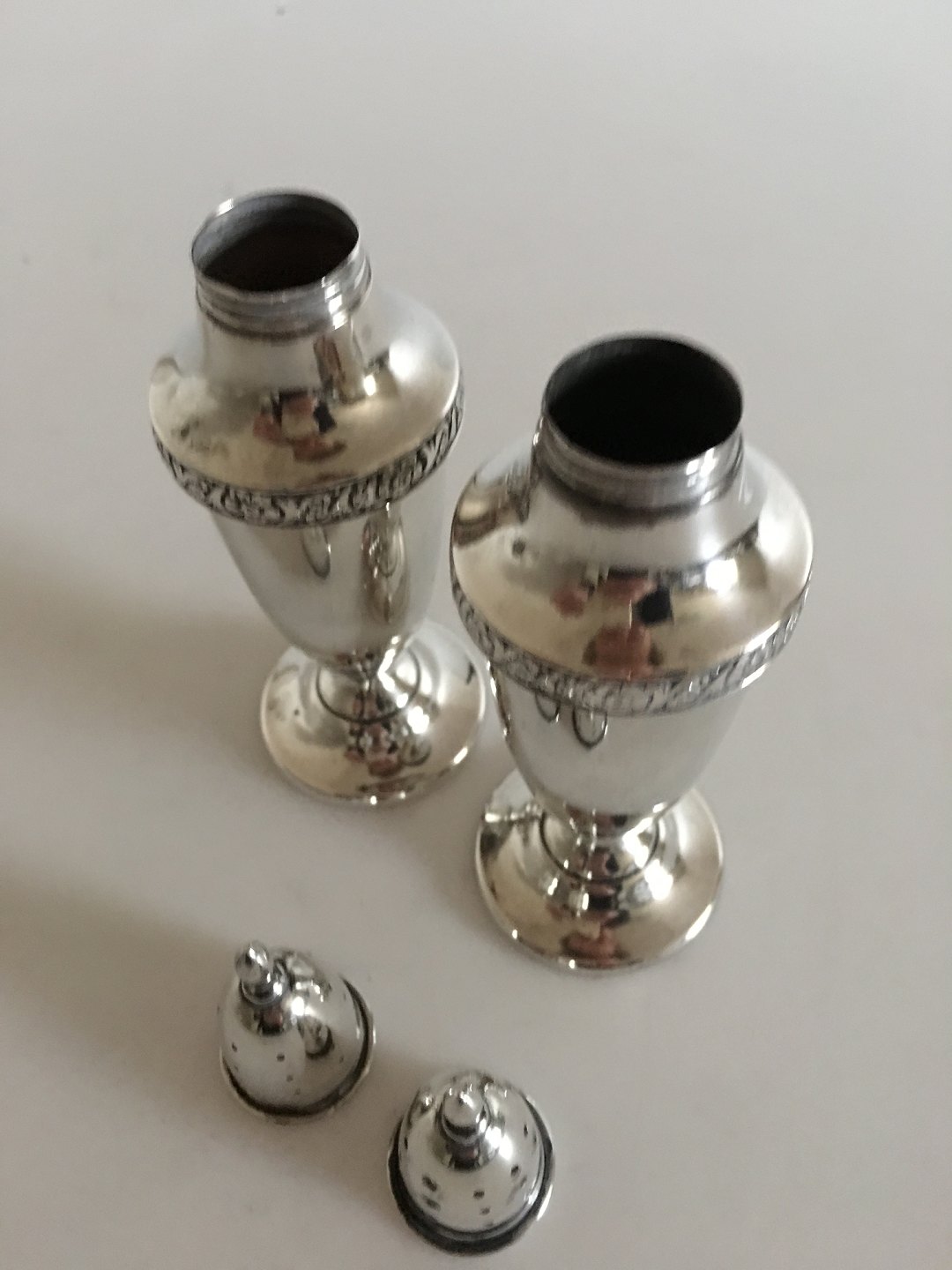 Et Sæt af To Strøbøsser i Sterling Sølv. 14.5 høje. Vejer tilsammen 95 gram. Den ene af dem har en lille skramme / hak på siden (se billede) Ellers i god stand. Er nummereret med tallet 403 underneden