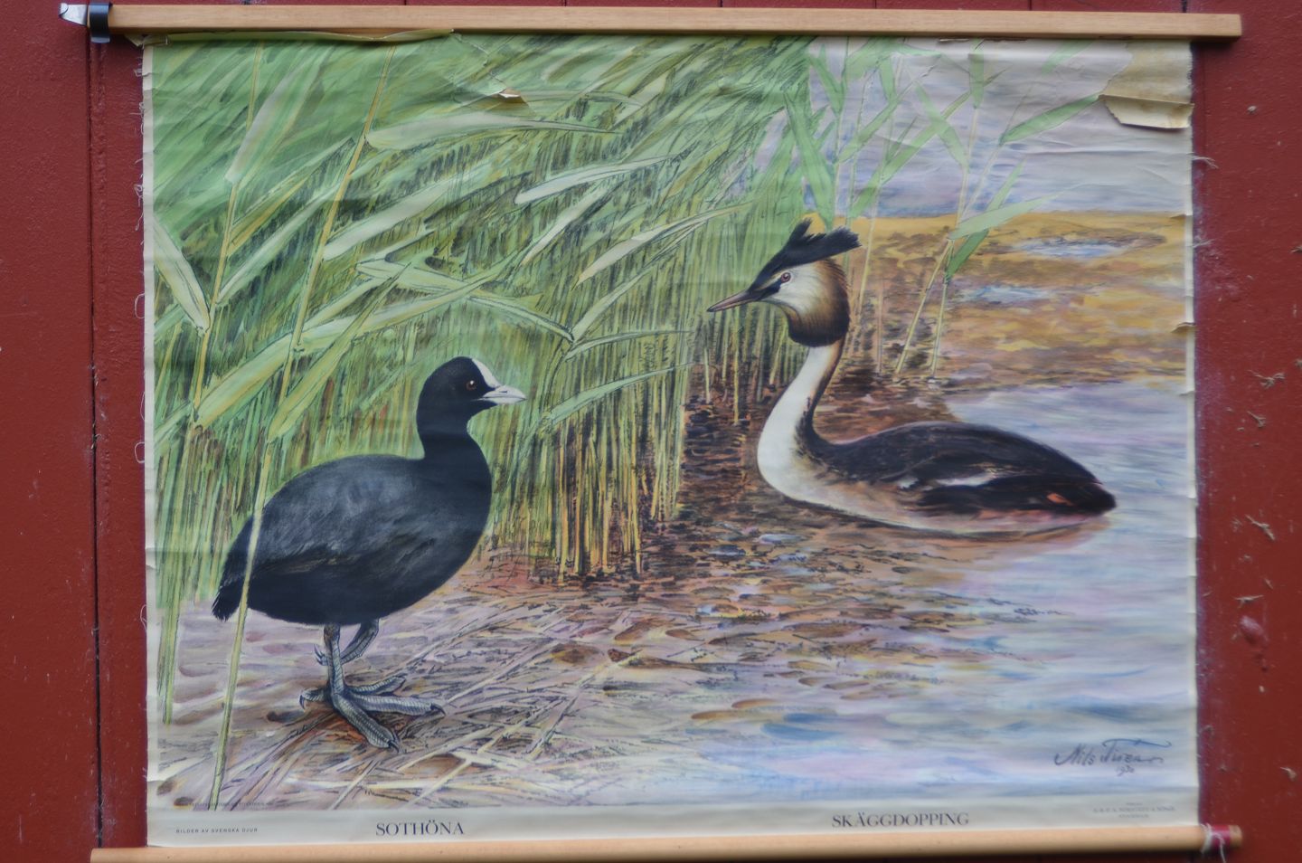 Outlook board with wooden sticks: Coots and grebes, Image dimensions: 71 x 94 cm