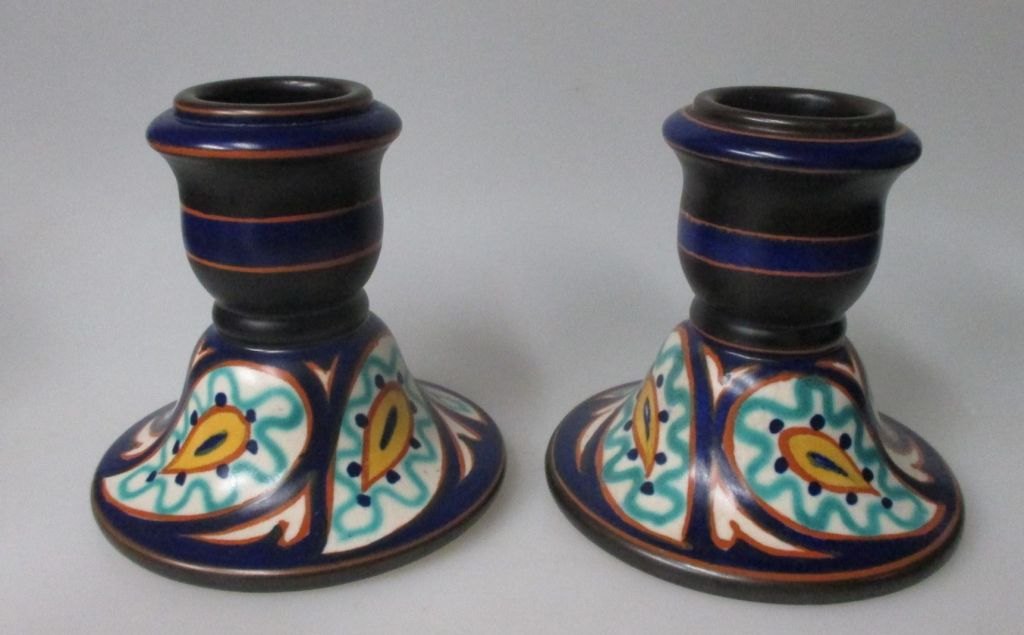 Par Gouda lysestager, 20. årh. Holland. Fajance. Håndmalet. Polykrom dekoreret. Højde.: 11,5 cm. Signeret.: DOBP Plazuid, Gouda, Holland.