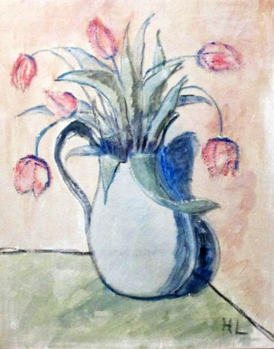 Leth, Harald (1899 - 1986) Danmark: Opstilling med en kande med tulipaner på et bord. Olie på plade. Signeret.: Monogram. 75 x 61 cm.